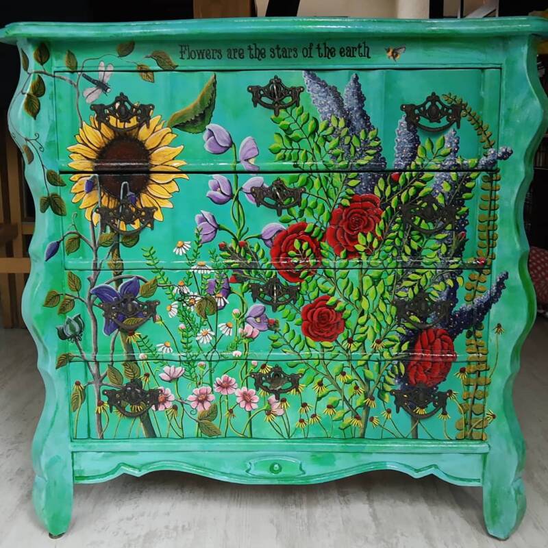 Vrolijke ladekast 104m hoogte, handbeschilderd met acrylverf en nabehandeld met bootlak!