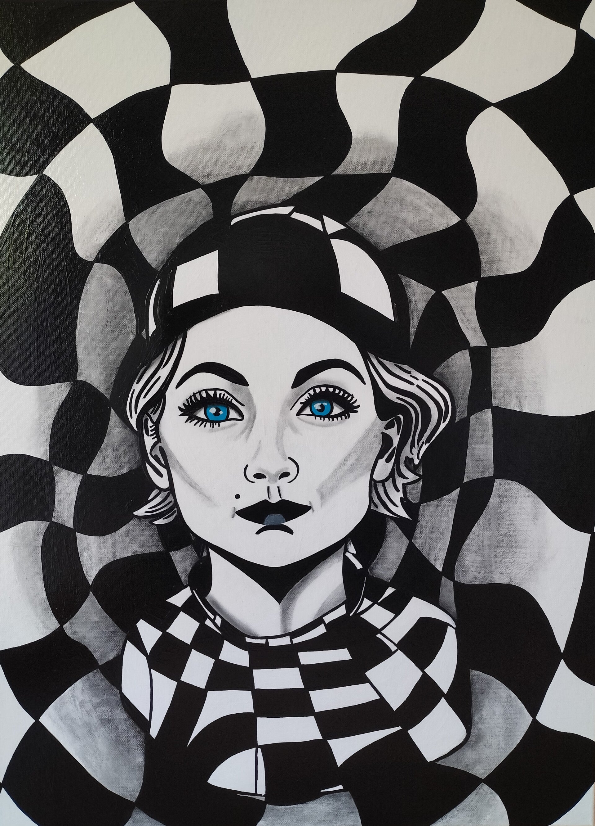 Dit krachtige schilderij is een expressief portret, waarin realisme en abstractie samenkomen. De vervormde zwart-wit patronen symboliseren de chaos van gedachten en emoties, terwijl de felblauwe ogen het anker vormen van rust en focus. Een uniek werk dat niet alleen visueel intrigeert, maar ook persoonlijkheid uitstraalt.